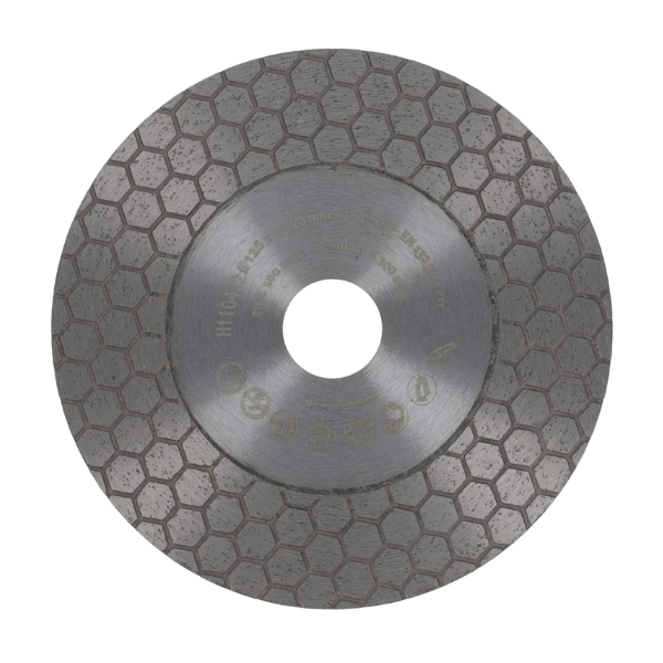 Disco per tagli a 45 gradi da Gres porcellanato e Ceramica. Disco spessorato con diamante a nido d’ape su entrambe le facce, ideale per tagli inclinati a 45° a secco, con smerigliatrice angolare.