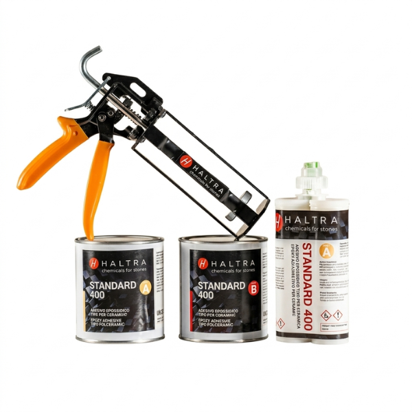 Adesivo bicomponente tixotropico e caricato, perfetto per incollaggi sicuri e duraturi su ceramica, gres, terrazzo, agglomerati di quarzo, pietra naturale, calcestruzzo e molti altri materiali.